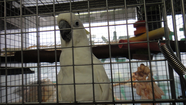 国内ブリードの1歳の超ベタ馴れのアオメキバタンが入荷です。実は2週間位前に入荷していて、今ではすっかり環境にも慣れたようで元気いっぱいです!当店は熱帯魚屋なんですが、猛禽類やこんな鳥もたまに入荷します。目の周りの羽毛の生えていない部分がうっすら青っぽいのでアオメキバタンです。実際に瞳が青いわけではありません・・・。そんなことはどうでもいいのですが、この個体は本当に良い子でベタベタに馴れています!!ケージのそばに行けば寄ってきて頭を出して”いいこいいこ”の催促をしてきますし、ケージの扉を開ければ体を傾けながら翼を持ち上げて脇の下の”いいこいいこ”を催促してきます!人を選ばず誰にでも懐いているのですが、気に入った相手ならケージから出て肩に乗ってきて鳥の方から頬擦りしてきます!こんなに良く馴れたキバタンは今までで初めてです!本当にスキンシップの好きな甘えん坊なので鳥との時間をしっかりとってあげられる方にオススメです!ゴニョゴニョとおしゃべりの練習(?)もしていますし、まだまだ上手ではありませんが、たまに「コンニチハ」っぽい感じの言葉をしゃべっていますので、教えてあげれば簡単な言葉ならおしゃべりしてくれると思います。餌はマズリーのオウム用ペレットとリンゴ等の果物を与えています。