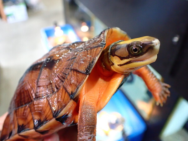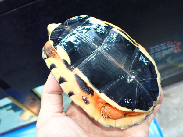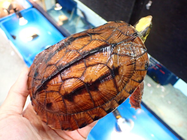 黄色やオレンジの発色がとてもキレイな個体です。甲ズレや尾切れ、爪欠けなどのない完品です。餌も人工飼料に餌付いてますので安心です。高価なカメですがこのサイズなら丈夫なので飼育は難しくありません。流通量の少ない希少なカメです。マニアの方いかがですか?上段、中段の画像です。4つの画像は同一個体です。