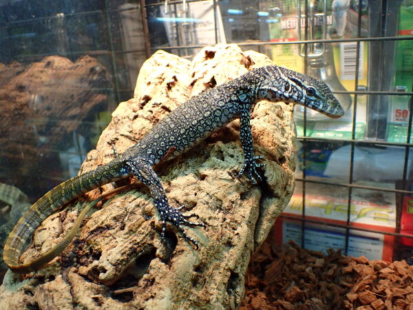見た目はかなりカッコいいし値段もお手頃なんですが性格が・・・。稀に馴れた個体を見かけることもありますが、基本的には気の荒い種類なのである程度爬虫類の扱いに慣れている方の方が良いと思います。頑張って馴らしてみるっていう挑戦もアリだとは思いますが、観賞用に割り切って飼育するのもアリです。実際見た目のカッコ良さはモニターの中でも上位です!左下の画像です。