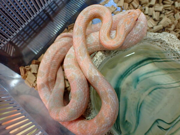 バブルガムの血統ですがグリーンの発色が弱いのでピンクブロッチとして販売します。ピンクの発色は申し分ないので現状でもすごくキレイですが、まだ若い個体なのでこれからグリーンが発色してくればバブルガムに化ける可能性は十分あります。餌食いは良好でホッパー食べられるサイズです。この色は画像では全然伝わらないのですが、実物は画像よりもはるかにキレイです!こんなにキレイなピンクスノーがこのサイズでこの値段は超激安です!1匹のみなので早い者勝ちです!右下の画像です。
