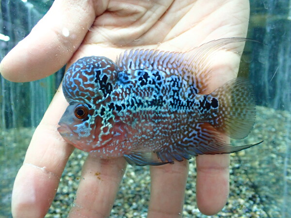久しぶりにフラワーホーン仕入れてみました。おでこしっかり出てて発色も良いし、体型もセミショートっぽい詰まった感じでかなり良い個体来ました!気が強いので混泳には向きませんが人に良く馴れてペット的に飼えるから単独で飼っても全然淋しくない魚ですよ!中段右の画像です。