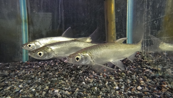 Chanos chanos です。サバヒーという名前はけっこう聞いたことがあるのでは?日本ではあまりなじみがありませんが、アジアの広い地域では食用として重要な種で、養殖も盛んにおこなわれています。本来汽水域に生息する魚ですが、淡水への適応力も高く、現地では水田などを利用して殖やしているそうです。今回入荷したサバヒーも現地では純淡水でストックされていたそうなので淡水飼育でも問題ありません!銀色の鱗がキレイで、大型になりますし、かなりかっこいい魚なのですが、何故か今まで観賞魚としては輸入されることがほとんんどありませんでした。今回少数が入荷しましたのでご興味のある方はいかがですか??中段右の画像