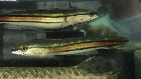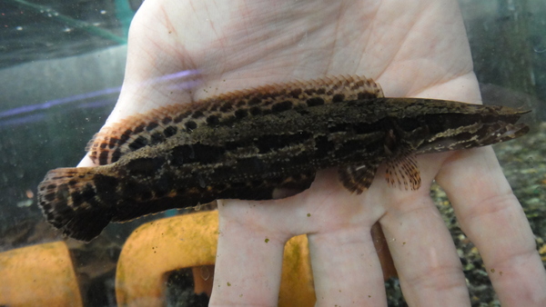 ギニア産のアフリカンスネークヘッドです。体側の黒いスポットが片側はライン状につながったおもしろい模様の個体です。もう片側は半分位つながったような感じの模様です。模様の面白い個体を選んできましたので入荷は1匹のみです。変わった個体がお好きな方には良いと思いますよ!