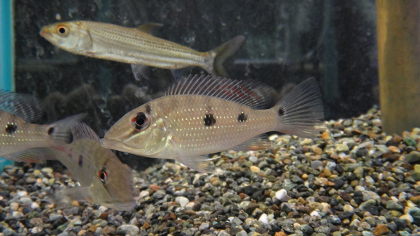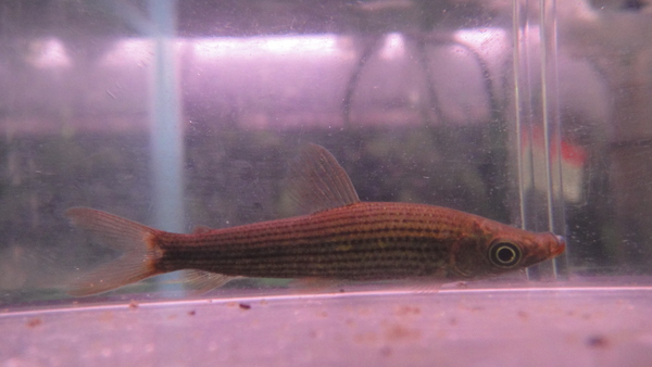 インボイスはサルトールspでしたが違いました。これはLaemolyta garmaniという珍しい中型カラシンですね。アノストムス ガルマニィとされることもありますが、ラエモリタが正しい属名のようです。ひょっとこのような上向きの細く突き出た口が特徴のサルトールやアノストムスに近縁なアノストムス科の激レア中型カラシンです。最大では20cmをかるく超えますので大きくなったらけっこう迫力がでると思いますよ!サルトールが来ると思って楽しみにしてたのでちょっと残念でしたが、ラエモリタもサルトールと同じ位に珍しい魚なのでまぁいいですけどね。はっきり言って超マニアックな魚でそんなに人気があるわけでもありませんし、というか人気なんて全然無いし・・・。もしこの名前を知っているという人や、欲しいなんていう人は、バカがつく位の(良い意味というか褒め言葉的な感じで!?)スーパーマニアですね。今までもアノストムスspとかレポリヌスspとかそういうインボイスで他の魚に混じって極少数のみが輸入されたことがある程度でまとまって輸入されるような魚ではありませんので今後もまず入ってくることはないと思います。(たぶんそうは売れないと思いますけど、)入荷は少数のみです、お早めに!!左下の画像