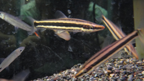太く黒いラインと金色の地色のコントラストがけっこうキレイなアノストムスです。値段は安いですがなかなかキレイな良い魚です。右下の画像