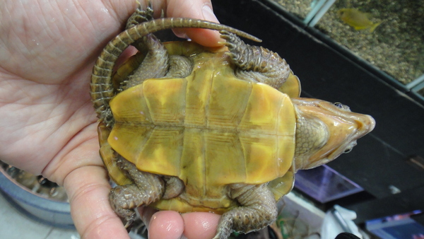 オレンジ色のすごくキレイな個体なのですが、残念なことに軽微な多甲板です。よく見ないとわからない感じの小さな多甲板なのでこの値段ならお買い得だと思います!!それ以外には欠点はありません!状態も問題なく、人工飼料をよく食べます!ここ最近は選べるほどのオオアタマガメは入ってきていませんのでこの位の多甲板なら買いだと思います!
