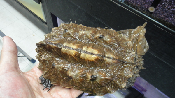 産地はよくわかりませんが大きめで迫力のあるサイズのマタマタが入荷しました!甲長は15cm位ですが、首が長く頭も大きいので全長では30cm近くありそうです!もちろん完品でキズや甲ズレ、爪とびはありません!状態も良好でオススメの個体です!小さめの方がいいという方には甲長7~8cm位のガイアナ産の顔の黒いブラックタイプの個体も在庫ございます。