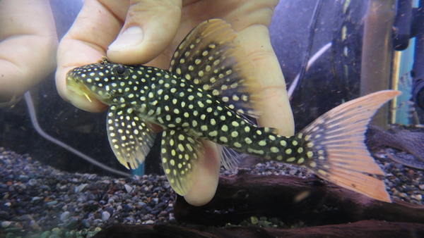 真っ黒に真っ白のスポットの入ったキレイで人気のプレコです!トリム系の種類ほどではありませんがこの仲間もトゲトゲしていてけっこうかっこいいです!