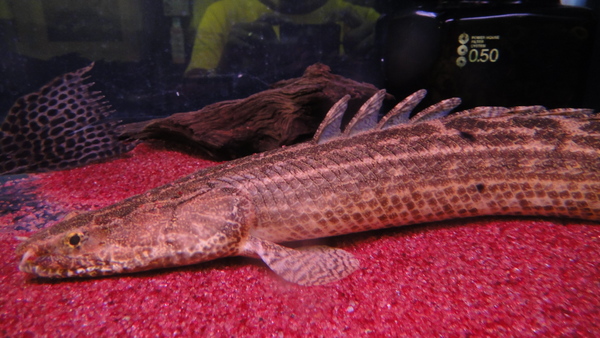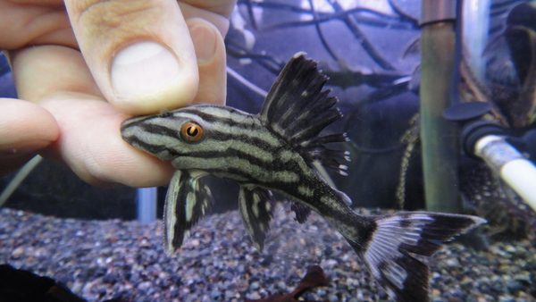 トゲトゲしていて、額のあたりには角みたいな突起があってかなりカッコいいシルエットのプレコです!グレーの体にブラックスポットが入り、体色も渋くて良いです!!