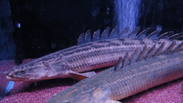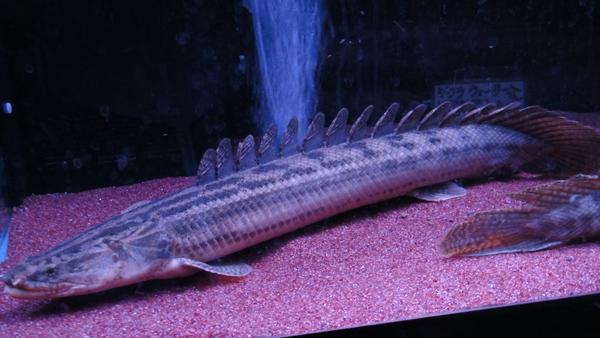 サイズは50cmとしましたがこの個体ももう少し大きいかもしれません。また、上記の個体より長さは少し短いですが太さはこっちの個体の方が少し太くてすごく迫力があります。模様も全体の体色が濃い個体なので、黒底の水槽で飼い込めば濃い緑色が発色すると思います。しかも背ビレも16本ありますので飼い込んで色が出ればトゥルカナのビキールにも見劣りしない素晴らしい個体に仕上がると思います!ただし、現状尾ビレの一部に裂けている部分があります。少しづつ再生してきていますので問題は無いと思いますが、気になる方は画像でご確認ください。
