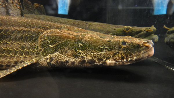 素晴らしい!!色、模様も超キレイ!顔も扁平でカッコいいし、肩のあたりからグンと盛り上がって太さもあり、かなり迫力あります!背ビレも16本あってチャドビキにしては多い方なのでトゥルカナ産と比べても全然見劣りしない個体です!左下の画像では鼻管が曲がっているように見えますが、水槽に当たっているためで実際は問題ありません。