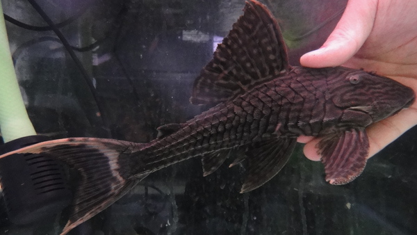 ファンフィープレコのインボイスで入荷しましたが、聞いたことのない名前です。パッと見は茶色っぽい地味なペコルティア系のプレコの大型個体かな?という感じです。色は地味ですが、尾ビレのフィラメントが伸びてシルエットはかっこいいです!中段右の画像です。