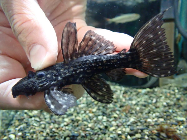 黒っぽいオリーブグリーンにオレンジのヒレ先が特徴のプレコ。一見地味っぽい感じもしますが体色の濃淡が環境や気分によって変化するので鮮やかなオリーブグリーンに発色した時なんかはかなりキレイですよ!ぜひ飼い込んでみてください!右上の画像です。