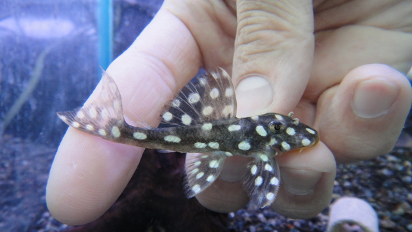 黒地に白い水玉模様のかわいいプレコです!あまり大きい個体が輸入されることはありませんので、がんばって大きくしましょう!