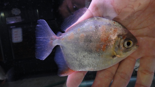 ビッグアイパクーのインボイスで入荷しましたが、この個体も少しだけ体側の朱色の班が出ています。それで、たぶん上記のレッドスポットパクーと同種で、オスとメスだと思います。レッドスポットは臀ビレの真ん中辺りが広がったような形になっていて、ビッグアイは臀ビレが長めで、真ん中辺りがえぐれたような形になっています。