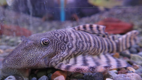 なんか変な名前のプレコですねぇ。誰がつけた名前なんでしょうか??名前はどうあれ、魚自体はとっても素晴らしいです!顔に入るラインはものすごく細かく、体側のバンドもすごく細くてとってもキレイです!水槽に入れてすぐに写真を撮ったので少し色が薄いですがレッドタイガーのように赤味が強く発色するプレコです!