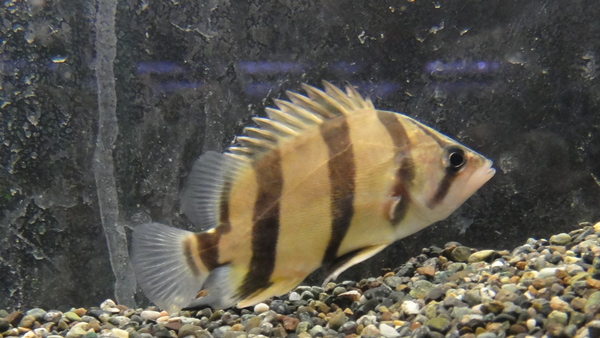 超かっこいい!!なんか海水のハタの幼魚みたいな感じです。とっても入荷の少ない韓国産のオヤニラミで日本のオヤニラミよりも大型になる種類で最大で25cmほどになります。産地からもわかる通り、温帯性の魚ですから絶対に外に逃がさないように!!中国のケツギョやソガリと呼ばれる韓国のケツギョなどの魅力的な魚が特定外来生物に指定されて飼育できなくなってしまったように、この魚がそうならないようにという飼育する方の意識が大切です!大変入荷が少ない魚ですのでこういうのが好きなマニアの方はお早めに!!