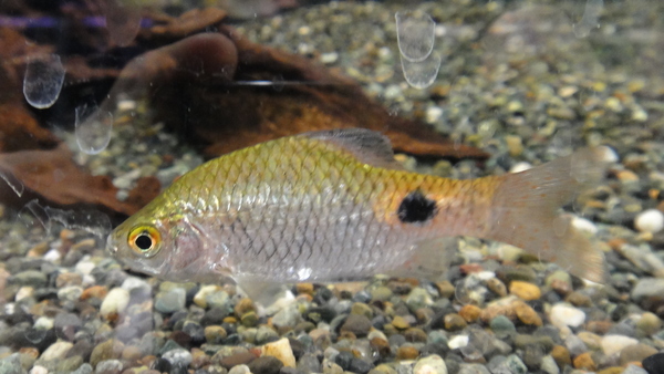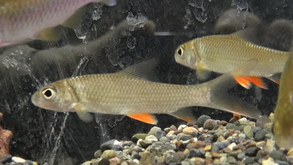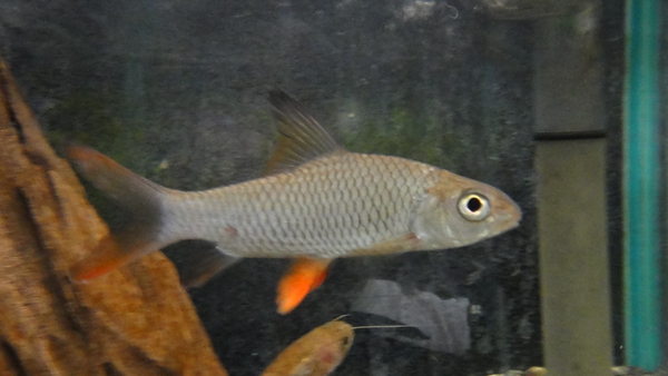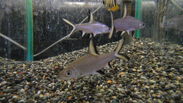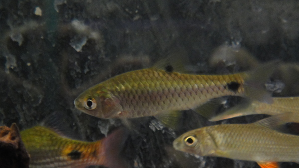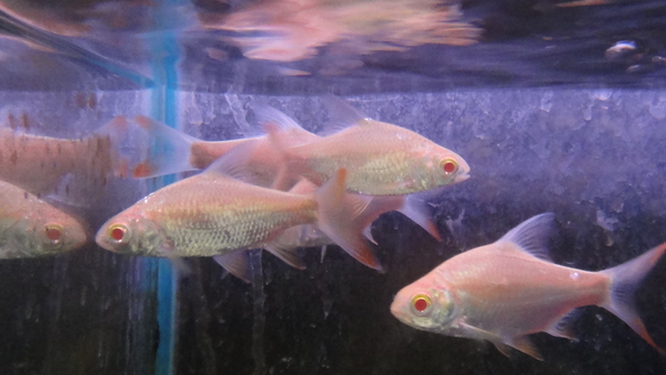 これはよく分からないです。以前にレッドギルカープのインボイスで入荷したことのあるプンティウスオルフォイデスとは違う謎の魚です。まだ小さいからなのか、鰓の赤い発色はあまりはっきりしていませんが、体の鱗の光沢がビカビカキレイです!まぁまぁ珍しい魚だと思います。中段左の画像です。