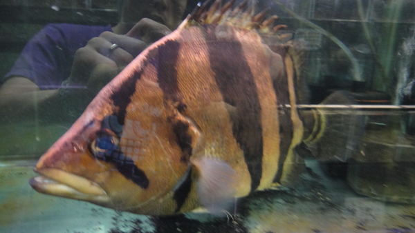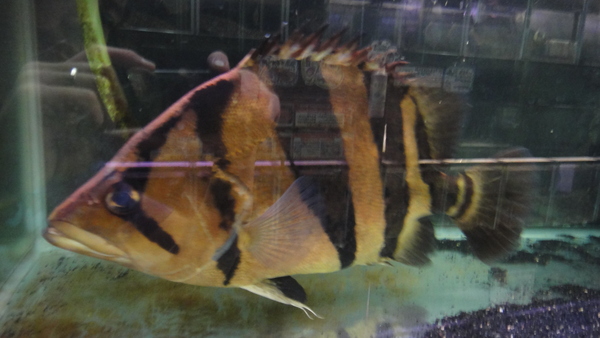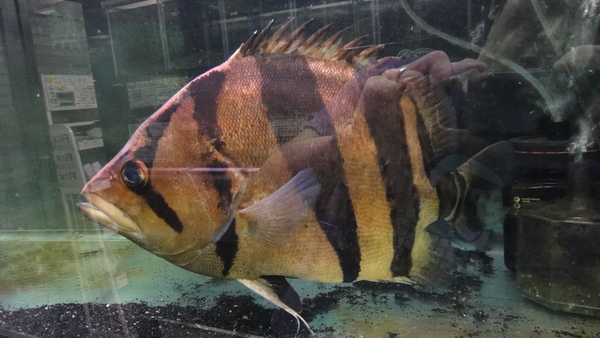 お客様からの下取り個体ですが、本ダトニオが入荷しました。サイズは43cmか44cm位です。かなりキレイな個体でキズや欠点もなく完品個体です。バンドもキレイで尾筒のVバンドも完璧!!腹も巻いてます!首がもう少しという感じで巻いていませんが、それ以外はバッチリ!背ビレにはバンドが入らないタイプの個体で、背ビレにバンドが入るか入らないかがタイ産かどうかを区別するポイントだとされることが多いようですが、正直個体差もあると思うので私は何とも言えませんが、背ビレにバンドが入らないなら入らないでそれにこしたことはないかなと思います。とにかく、迫力のある素晴らしい個体です!水槽から出して撮った画像ではバンドの色がとんでしまっていますが、本来はとってもキレイに発色している個体です。写りこみやらピンボケであまりキレイな画像ではありませんが水槽内の画像も載せておきますのでご確認ください。画像は全て同一個体です。サイズが大きいので発送はできません。