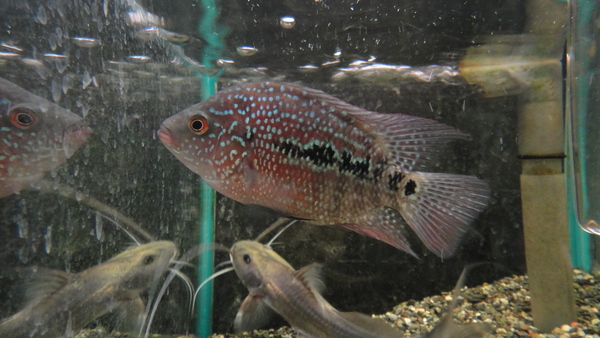 一応レッドテキサということですが、なんかイメージとはちょっと違うかも・・・。レッドテキサスってフラミンゴシクリッドみたいにオレンジがかった赤に青いスポットが入るイメージだったのですが、今回入荷の個体は地の色が赤というか紅色でそこに青いスポットが入る感じで、どっちかっていうとフラワーホンとかみたいな色なんですが、これが大きく育つとイメージ通りのレッドテキサスみたいになるのかなぁ??