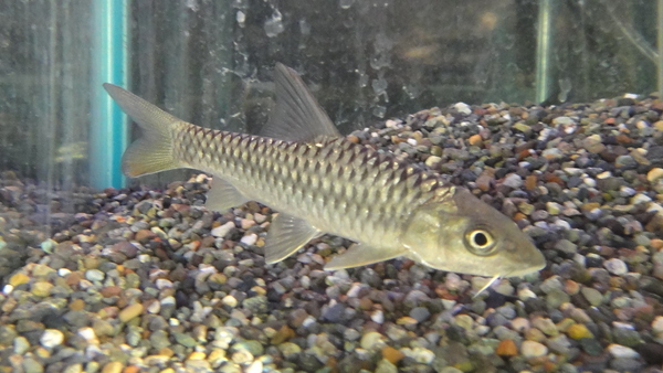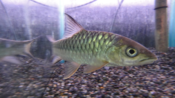 とっても珍しいコイ科の魚です。私も今まで見たことのない魚で、なんとも形容しにくいのですが、体型はアフリカのトリカラーシャークのような、ヒレの大きな魚ですが、ラベオやガラなどの魚とは違うようです。かなり大きくなる魚だそうで、野生では80cmほどになるらしいです。中段左の画像です。