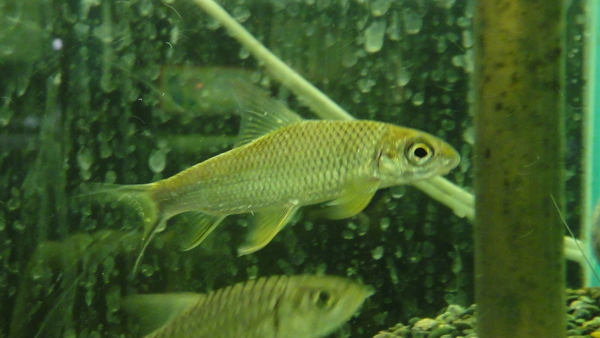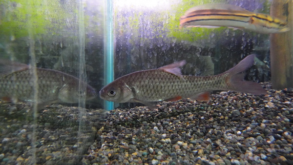 インドのバングラデイッシュ国境付近で採集された珍しいコイ科の魚で、夜行性の強い魚だそうで、昼間は洞窟に潜み、夜になると餌をとりに動き始めるらしいです。見た目はちょっとスリムにして、ヒレに色をつけたフナです。地味な魚ですがかなり珍しい魚ですし、珍しい性質もあり、マニア心をくすぐりますね!中段右の画像です。