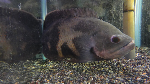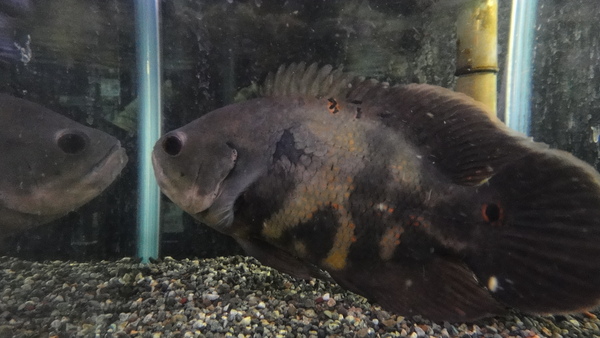 上段がオス親で、ネグロ産ルブロオセラータスということで来ていますが、たぶん違うかな・・・?体高は低く、顔も尖り気味で体型はそれっぽいのですが、模様、色が違う感じもします。それでも、元はもっとキレイに赤く発色していたのですが、メス親にボロボロにされてしまい、その後に再生した皮や鱗の色がとんでしまい赤い部分が少なくなってしまいました。ルブロオセラータスかどうかは分かりませんが、貴重なブラジリアンオスカーなのは間違いありませんのでいい魚だと思います。