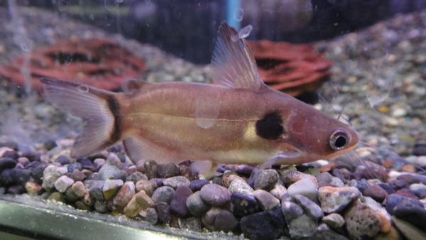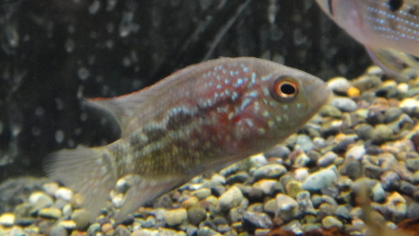 赤くなるテキサスシクリッドです。現状はあんまり赤くないです。喉、お腹のあたりがうっすら赤いだけですが、大きくなるにつれて赤くキレイになっていきます!