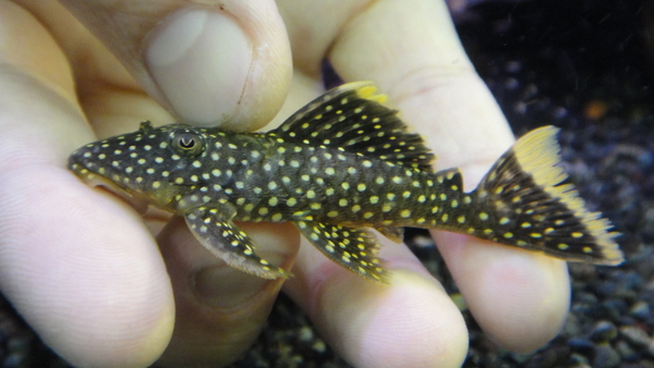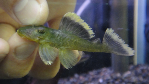 濃い黒っぽいオリーブグリーンの体色にヒレのエッジがしっかりオレンジ色になるキレイなプレコです。