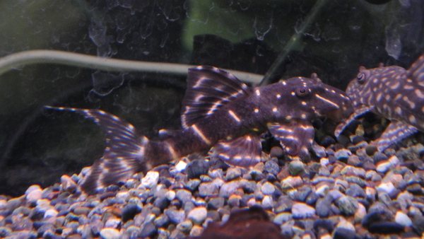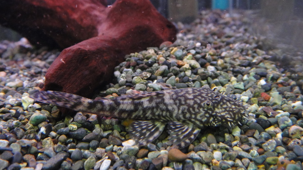 頭部に唐草模様の入るちょっと派手めなブッシープレコです。ブッシーの仲間はコケも食べてくれますし、丈夫で飼いやすいので水槽の掃除係にもいいのでは??