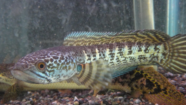 なんでしょう??こいつは正体不明のドワーフです。なんか妙に色が白いんです。突然変異とか色彩変異とかではないようですが、なんか変わった印象を受ける魚ですね。スネークヘッドマニアの方いかがですか??