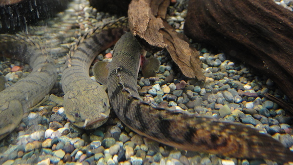 インボイスはアナコンダシンブランクスでしたが、小さくてよくわかりません。2匹入荷しましたが見た感じどうも違う魚のようです。1匹は赤っぽくて細かいオレンジ色の班が入り、体型は細く、目は小さめです。もう1匹は以前に入荷したアルゼンチン産のシンブランクスのような黄色っぽい茶色で背中にラインが入り、こちらの個体の方が長さは短いのですが体は太いです。うぅぅぅん、タウナギは謎の多い魚です!
