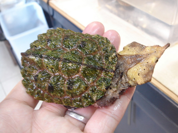 再入荷!野生では水底に沈んだ木の葉に擬態しているらしいです。変なカメです。