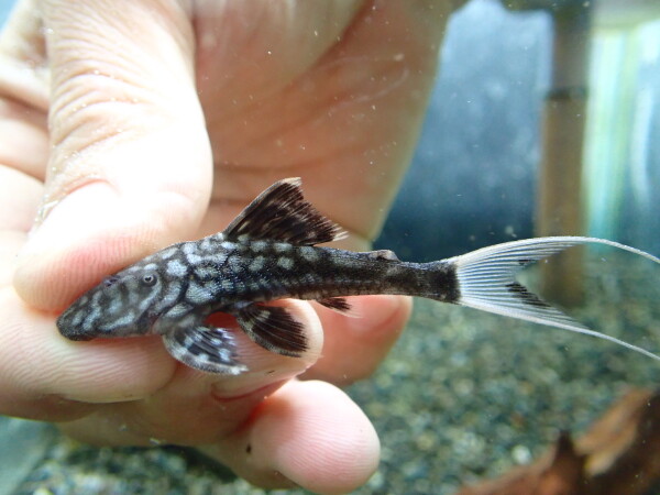 かなり久しぶりです!既に尾ビレのフィラメントは長く伸びていてホワイトテールな特徴がはっきり出ています。名前にアカリエスピーニョとありますが普通のアカリエスピーニョとは全然違いますしトリムプレコの仲間でもありません。大きくなっても尾ビレの白いフィラメントは長く伸びたままなのでごくシルエットのカッコいいプレコになりますよ。最近では滅多に輸入されなくなり見かけることもほとんどない希少なプレコになりました。マニアの方ぜひどうぞ!中段左の画像です。