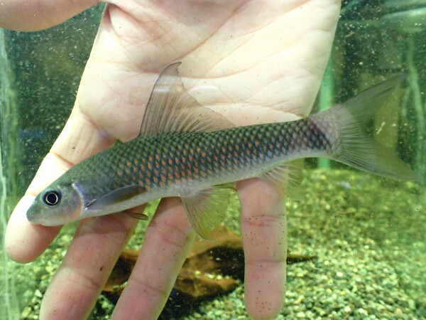 メコンギナspのインボイスで入荷しましたが詳細は不明・・・。鱗に入る赤いスポットがすごく鮮やかでキレイです。細身の体型で過去にスレンダードルフィンカープの名前で入荷したことのある魚にもちょっと似てる気がしますが、それよりも明らかに顔が長いですね。口元がラベオみたいで性格悪そうな顔してるんですが、全然大人しいです。同種同士でも全然ケンカしません。こういう謎のコイがお好きな方、いかがですか?左下の画像です。
