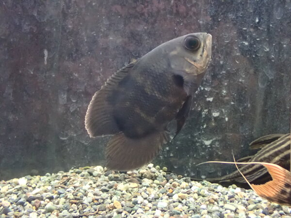 尾ビレが無くてハートテールになってます。ワイルドのオスカーでこういう特殊個体っていうのはかなり珍しいですね。たぶんですが他の魚に食べられちゃってとかの後天的な奇形だと思いますが、この状態でよく生き延びてきたなとびっくりです。こういう奇形は好みの分かれるところだとは思いますが、変わった魚とか特殊個体のお好きな方はぜひどうぞ!中段右の画像です。