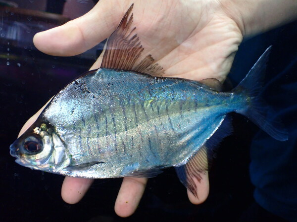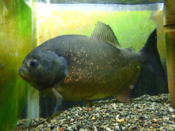 これ前から在庫してる個体なんですが17cmの個体が入荷したからついでに載せてみました。結構前にもっと小さいサイズで入荷してお店でここまで大きくなりました。これ入荷した時はピラヤがあんまり流通してなかった時だから仕入れ値も高くて・・・、なのでちょっと高いと思われるかもですが、値段は来た時から据え置きのままなんです・・・。でも20cmあるから結構デカいし、そろそろ値段に見合ったサイズになってきたかなと思います。あと何よりも体色が変わってるんですよね。来た時から体色がくすんでて全体的に暗っぽい感じだったんですが、成長につれてかなり黒くなってきてます!ナッテリィでは黒っぽい個体もけっこういますが、ピラヤでここまで黒いのは珍しいですね。ただし飼い方や飼育環境によっては黒くなくなってしまうかもしれませんのでその辺はご了承下さい・・・。背中まん丸で体には厚みもありかなり良い感じです!黒いから余計大きく見える気がしますね!マニアの方、ちょっと変わったピラヤいかがですか??中段左の画像です。