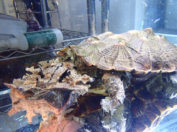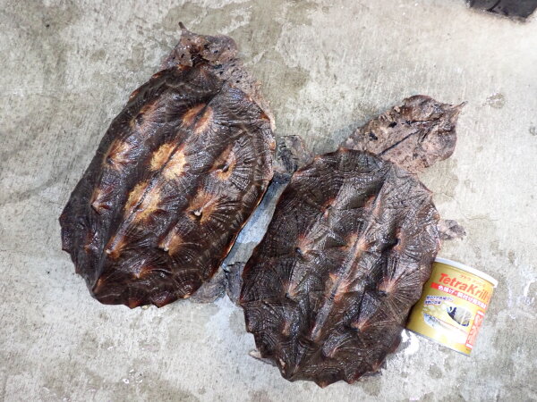 怪獣なマタマタがもう1匹入荷してます。こっちの方がほんの少し小さいんですが、見た感じサイズ差はあまり感じないかも・・・。あとワイルドの大きいカメには結構あるあるなんですが、後ろの方の縁甲板に小さな穴が開いてました。捕まえたカメが逃げないようにここに紐とかワイヤーを通して繋いどくんですよね・・・。甲羅ごつくて厚みがあるし穴も少し斜めに開いてるので上から見たり横から見ただけでは開いてるの分からないです。だからそんなに気にならないと思いますが、ほんのちょっとサイズ小さくて甲羅に穴開いてるということでお買い得になってます。甲ズレや爪欠けはありませんし状態も良好なので、甲羅の穴気にしない方にはこっちの個体がお買い得でオススメです!