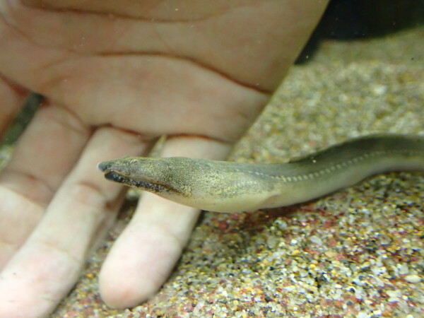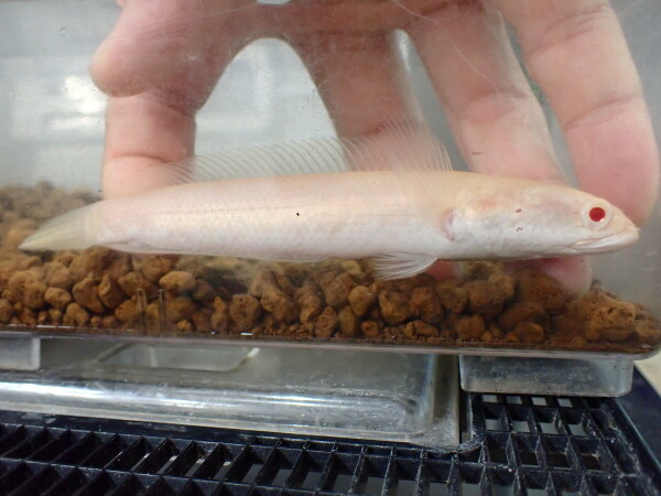 Lamnostoma mindora という学名のウミヘビの仲間。もともと採集例が極端に少なく、世界的にもとても珍しい魚です。台湾やフィリピン、インドネシアの一部などで分布が確認されておりましたが、数年前に沖縄でも確認され、沖縄がこの魚が発見された6か所目の場所で、分布の北限とされています。新種記載されたのはもう100年以上も前なのにほとんど見つかっていないというのは相当珍しい魚だということですね。ウミヘビの仲間の中では珍しく純淡水域での生息が確認されており、店頭でも純淡水でストックしております。独特な顔つきがかっこいいような気味悪いような、不思議な魚です。今後も安定して輸入されることはまずないと思いますのでウミヘビの仲間とか汽水魚の仲間とかがお好きな方は絶対に買っておいた方がいいと思います!こんなに珍しい魚の割には思ってたほど高くないので気になる方はお早めに!24日追記:3匹入荷しましたが残り1匹になりました。さらに追記:すみません、全部売り切れましたが問屋さんの在庫確認したらまだ少しいたので近日中に再入荷の予定です。上段の画像です。