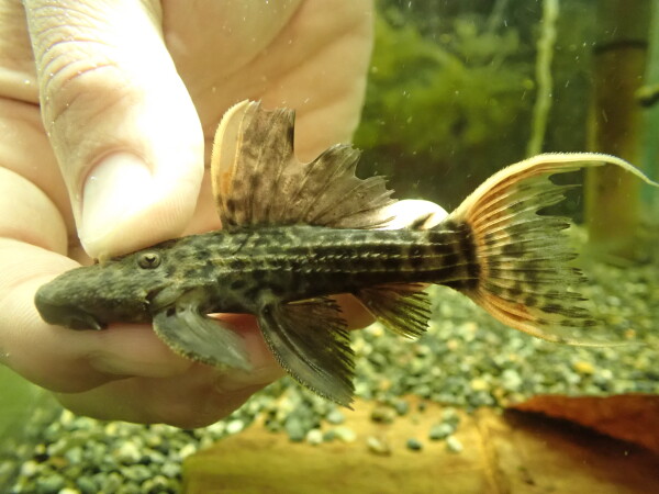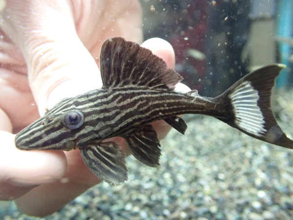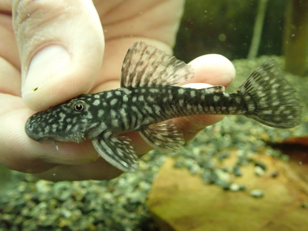 問屋さんにセアラってどこか聞いたんですけどね、どこだか忘れちゃった・・・。また確認しておきますね。Pseudancistrus genisetigerの学名が付いて輸入されましたが、頭部には厚みがありずんぐりした体型でPseudancistrus属の他のスパングルプレコの仲間とは全然雰囲気が違います。黒地に白い模様がキレイでダルマプレコをつぶしたような体型のかわいいプレコです。珍しいプレコなのでマニアの方いかがですか??左下の画像です。