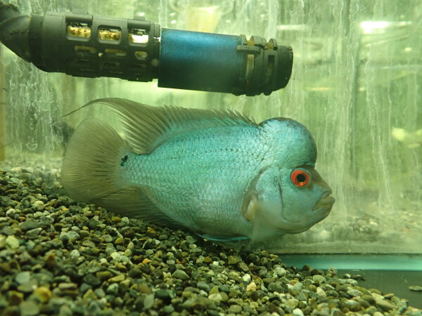 輸入直後なのでまだコブしぼんでますが、しばらく飼い込んで落ち着けばコブも大きくなってきます。青くてキレイな人気のフラワーホーンです!右下の画像です。