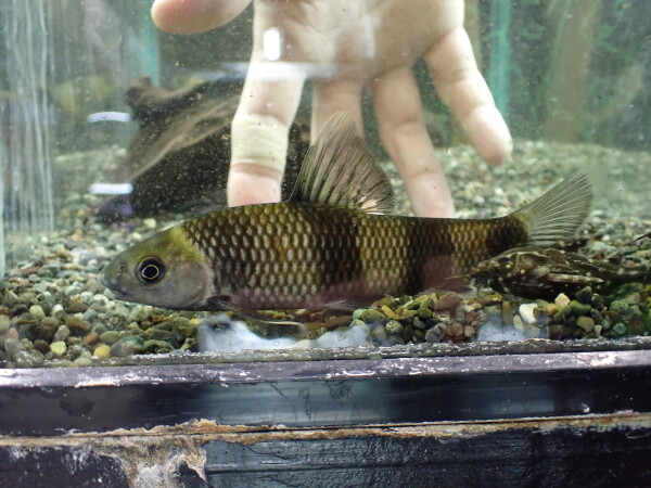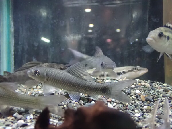 ナイジェリア産のラベオ。これ系のアフリカンラベオも前はいろんな種類が輸入されてて特に区別されることなく売られてたんですが、最近はあまり見なくなりました。まぁ人気無くてそんなに売れないですからね、問屋さんもあんまり輸入しないんだろうなぁ。性格の悪い個体も少なくないので混泳させにくかったりはしますが、中には大きくなる種類もいて、そういうのはデカくなると超カッコいいんですよ!緑がかった鱗に赤いスポットが入って結構キレイだし、じっくり飼い込むと実はとっても良い魚なんです!10年以上前は30cm近いサイズの個体が輸入されることもあったんですよ。懐かしいなぁ。中段右の画像です。