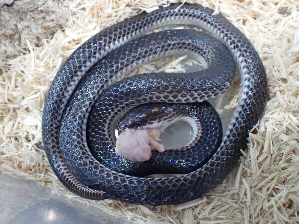 これも状態良好で餌食いも心配ありません!ピンセットからピンクLとかファジー普通に食べます!大きな餌を飲むのが苦手な種類なのでやや小さめの餌をあげるのがポイントですよ。ギラギラの虹色の光沢がとてもキレイなヘビです!右下の画像です。