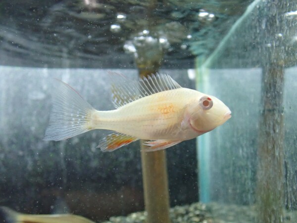 人気のアルビノヘッケリィが久しぶりに入荷!真っ白の体に赤い目やオレンジのヒレがアクセントになってとてもキレイです!丈夫なシクリッドなので混泳にもオススメ!右下の画像です。