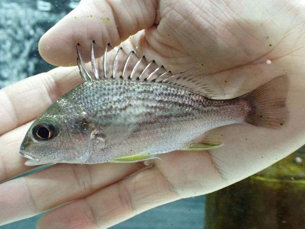 オーストラリア便で輸入されたクロダイ属の1種。種類はよく分かりませんが体側にはやや波打ったようなラインが入っています。腹ビレと臀ビレは黄色く、産地から考えるとサーフブリーム?全然分からないですけど・・・(笑)。中段左の画像です。