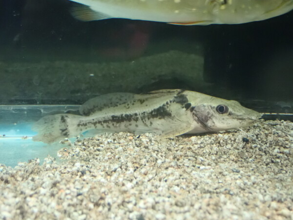 アフリカンサーベルシャークのインボイスで入荷しましたが、英名ではBlackstripe Barbって言うみたいです。Enteromius macropsという学名で最大17~18cmになるそうです。アジアのサーベルシャークみたいに体側に黒いラインが入り、レッドアイカラシンみたいに目がオレンジに光っててキレイです。これマックスサイズまで育てたら見ごたえある良い魚になりそうですね!中段左の画像です。